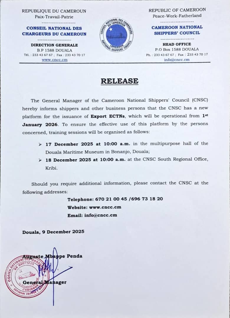 The General Manager of the Cameroon National Shippers' Council (CNSC) hereby informs shippers and other business persons that the CNSC has a new platform for the issuance of Export ECTNs, which will be operational from 1st January 2026. To ensure the effective use of this platform by the persons concerned, training sessions will be organised as follows: