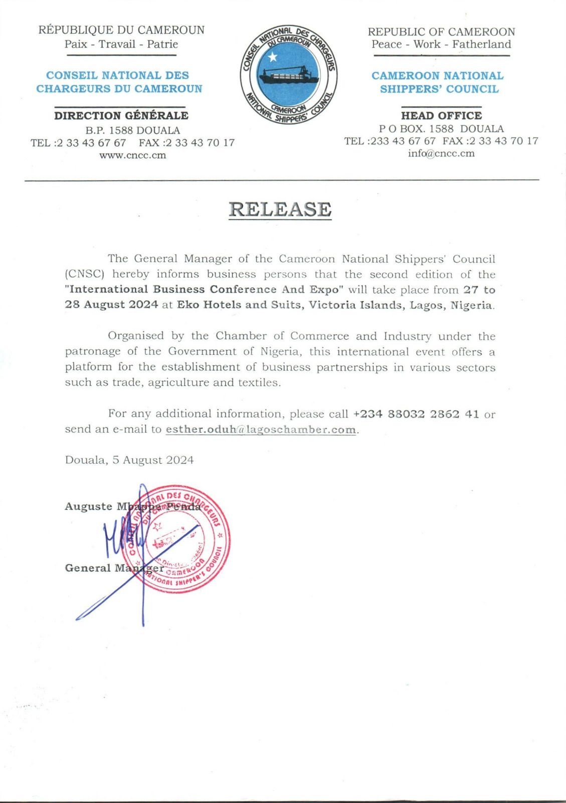 The General Manager of the Cameroon National Shippers' Council (CNSC) hereby informs business persons that the second edition of the "International Business Conference And Expo" will take place from 27 to 28 August 2024 at Eko Hotels and Suits, Victoria Islands, Lagos, Nigeria.