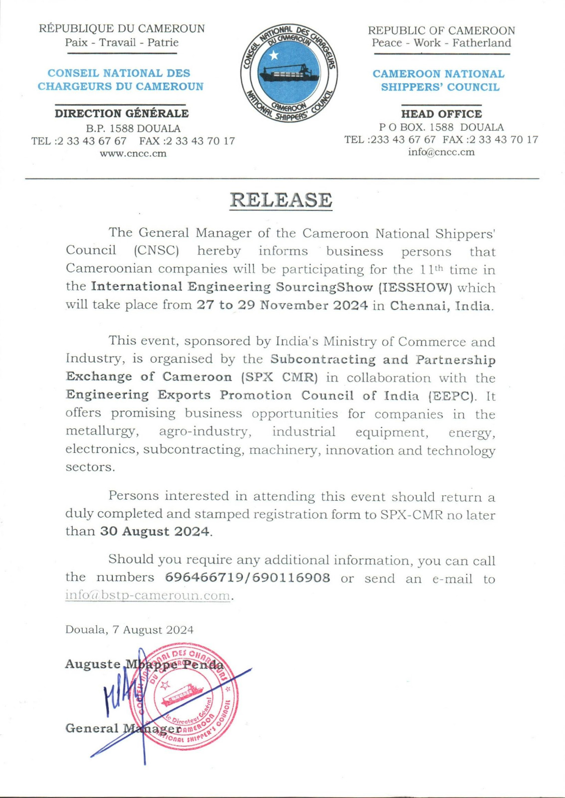 The General Manager of the Cameroon National Shippers' Council (CNSC) hereby informs business persons that Cameroonian companies will be participating for the 11th time in the International Engineering SourcingShow (IESSHOW) which will take place from 27 to 29 November 2024 in Chennai, India.