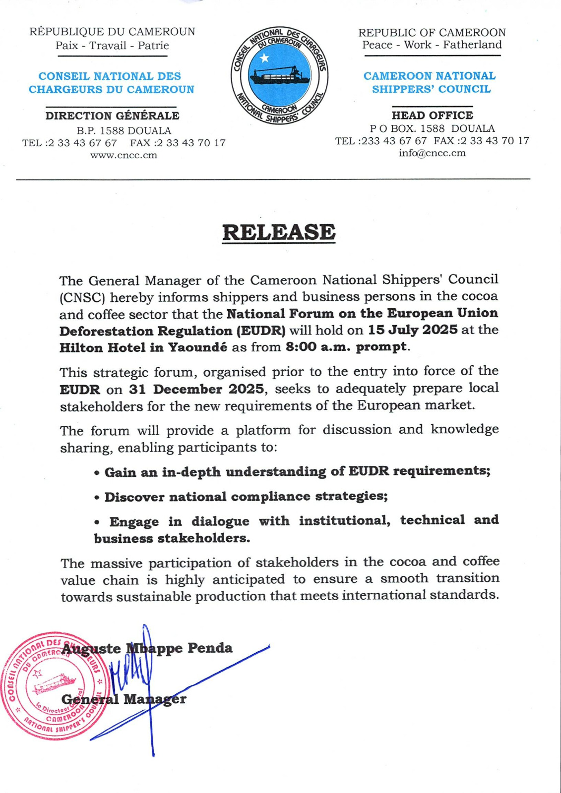 The General Manager of the Cameroon National Shippers’ Council (CNSC) hereby informs exporters and business persons that the