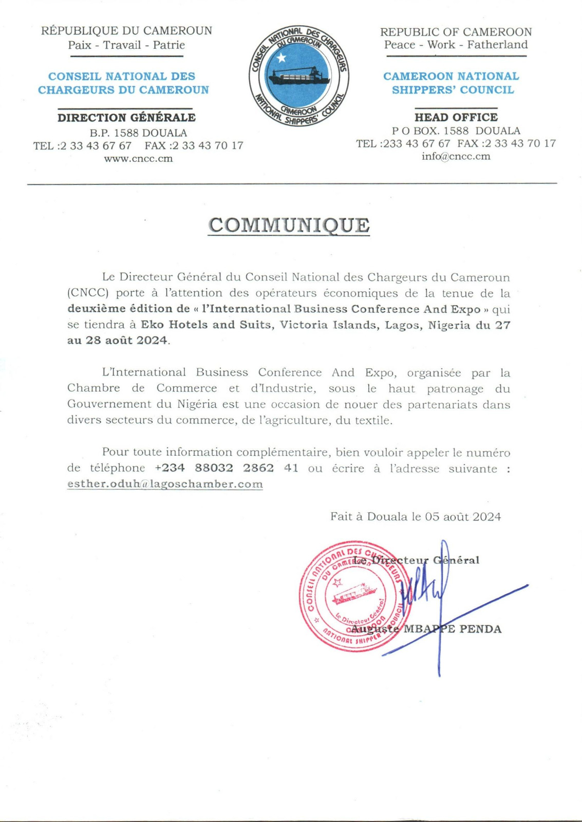 Le Directeur Général du Conseil National des Chargeurs du Cameroun (CNCC) porte à l’attention des opérateurs économiques de la tenue de la deuxième édition de « l’International Business Conference And Expo » qui se tiendra à Eko Hotels and Suits, Victoria Islands, Lagos, Nigeria du 27 au 28 août 2024.